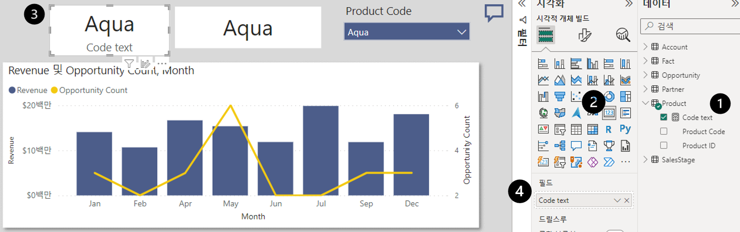 Product Code 슬라이서 옆에, 시각적 개체인 Card를 하나 만들고, Product Code 열을 Card 필드에 넣어요.